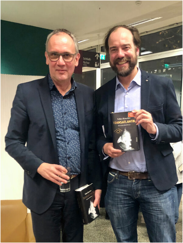 Volker Kutscher und Hanno Hochmuth bei der Buchpräsentation von Kutschers Roman “Transatlantik” im Jahr 2022. Foto: Nadja Zobel.